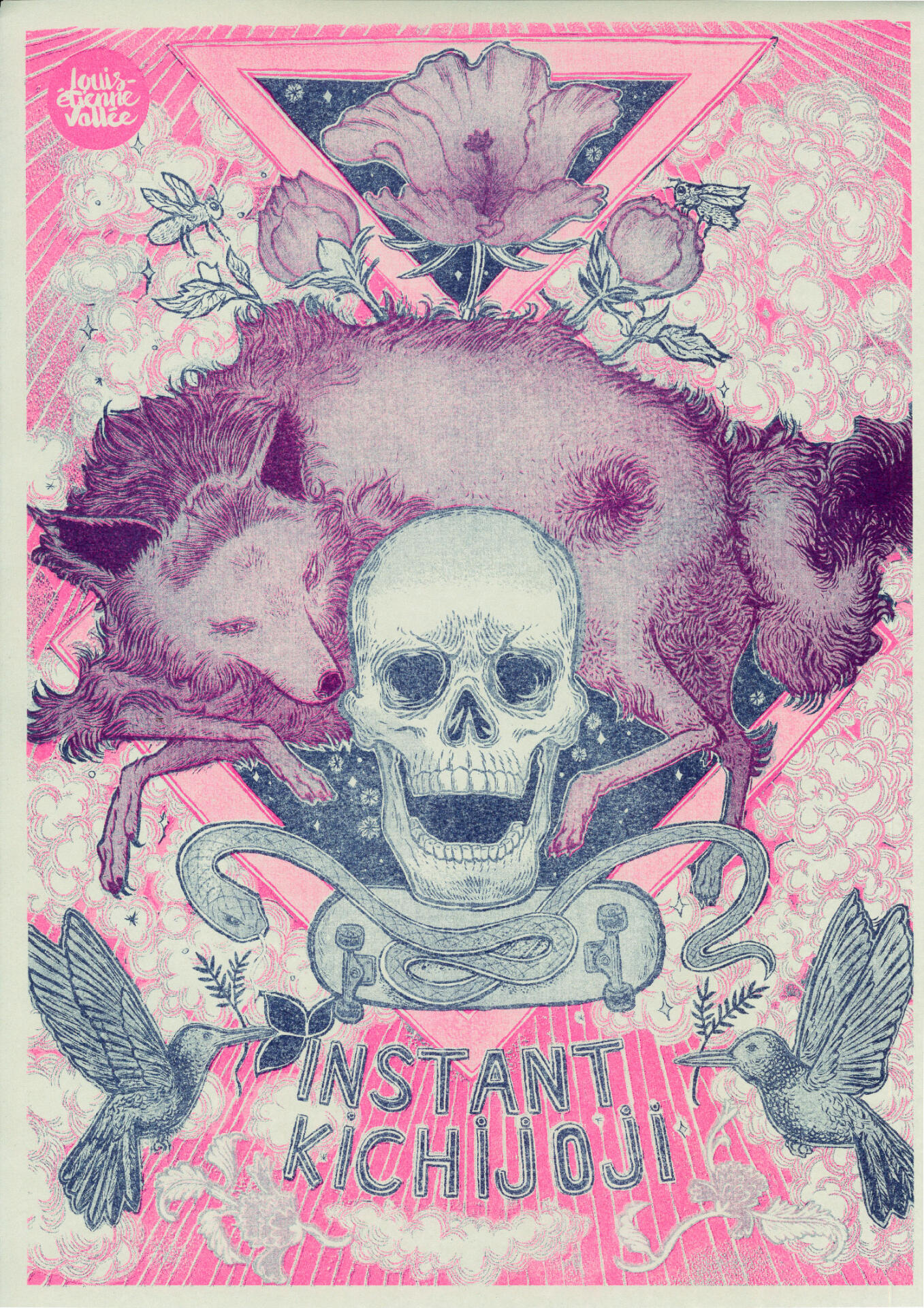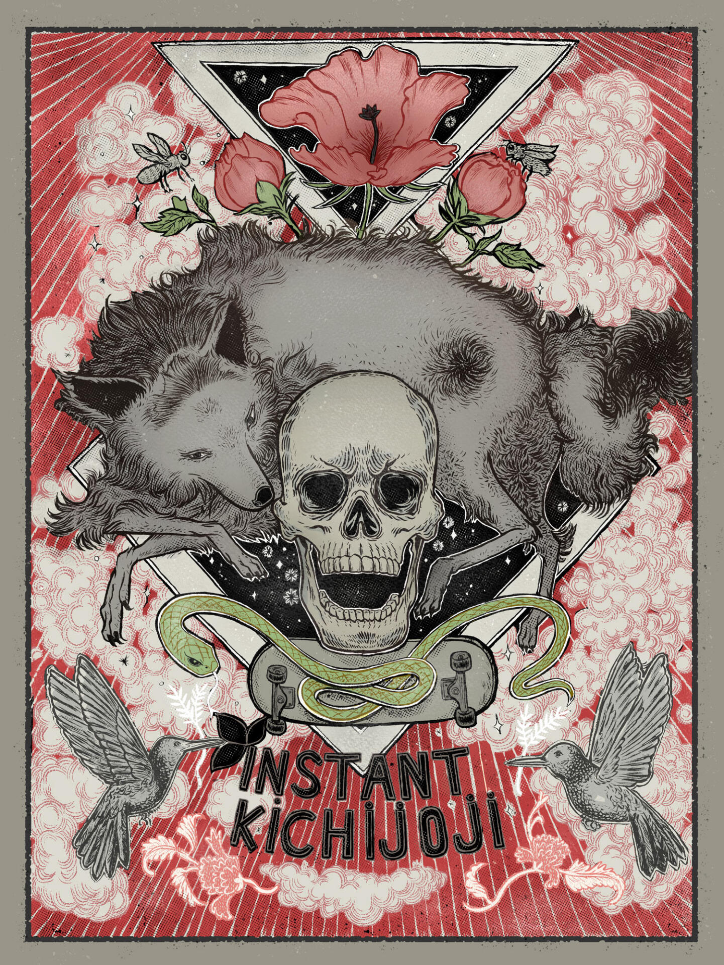 A fairy tale of two friend, a rapping skull and Bane, the wolf. Poster for Skateboard shop in Kichijoji (Tokyo).